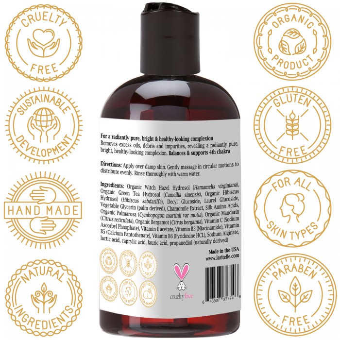 - CLEANS AND TIGHTENS PORES WITHOUT COMPROMISING SKIN'S NATURAL BALANCE. Improves skin's elasticity & perfects the complexion. Formulated with very mild soap base, powerful antioxidants and skin nourishing, youth-preserving oils of Palmarosa, Mandarin & Bergamot and non-alcoholic hydrosols of toning Witch Hazel, anti-inflammatory Green Tea & anti-aging Hibiscus. Perfect for either day or night use.