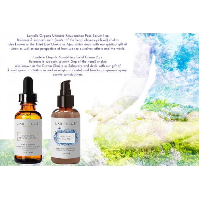 Laritelle Organic Nourishing Facial Cream - 2 oz Balances & supports seventh (top of the head) chakra also known as the Crown Chakra or Sahasrara and deals with our gift of knowingness or intuition as well as religious, societal, and familial programming and cosmic consciousness.