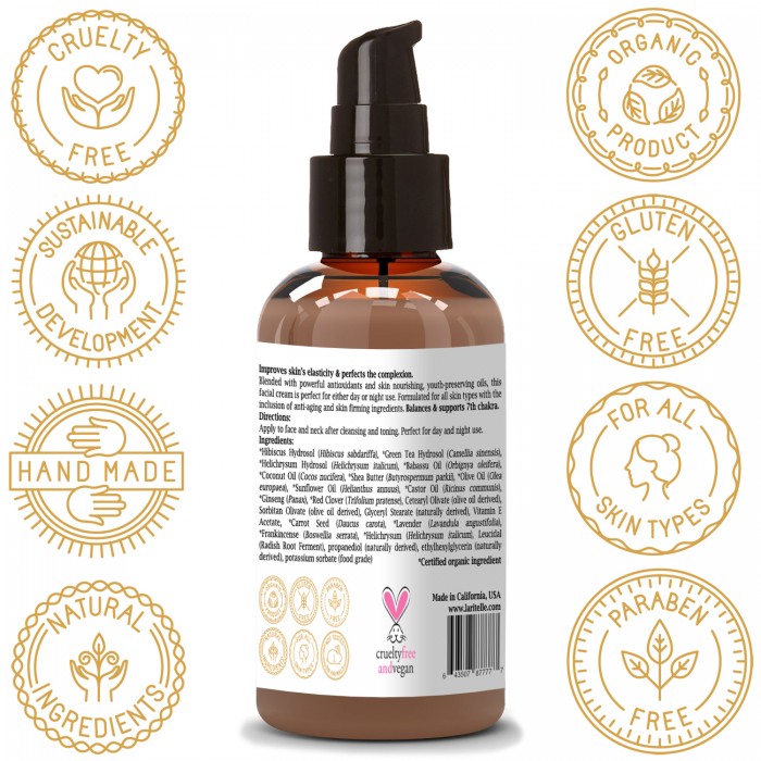 | Ingredients | Organic Hibiscus (Hibiscus sabdariffa) Hydrosol, Organic Green Tea (Camellia sinensis) Hydrosol, Organic Helichrysum (Helichrysum italicum) Hydrosol, Organic Babassu (Orbignya oleifera) Oil, Organic Coconut (Cocos nucifera) Oil, Organic Shea Butter (Butyrospermum parkii), Organic Olive Oil (Olea europaea), Organic Sunflower Seed Oil (Helianthus annuus), Organic Castor Oil (Ricinus communis), Organic Ginseng (Panax) Root, Organic Red Clover (Trifolium pratense), Cetearyl Olivate (olive oil derived emulsifier), Sorbitan Olivate (olive oil derived emulsifier), Glyceryl Stearate (naturally derived emulsifier), Vitamin E Acetate, Organic Carrot Seed (Daucus carota), Organic Lavender (Lavandula angustifolia), Organic Frankincense (Boswellia serrata), Organic Helichrysum (Helichrysum italicum), Leucidal (Radish Root Ferment, EcoCert-approved naturally derived preservative), propanediol (naturally derived preservative), ethylhexylglycerin (naturally derived preservative), potassium sorbate (food grade preservative) |