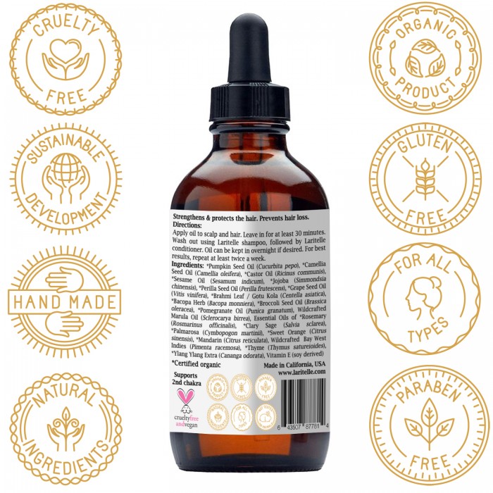 Directions Apply oil to scalp and hair. Massage into the scalp for a minimum of 2 minutes. Leave in for at least 30 minutes. Wrap a warm towel around the head to aid absorption of the oils. Wash out using Laritelle shampoo, followed by Laritelle conditioner. For best results, repeat at least twice a week. Directions for color treatment application: add 2-5 droppers or more (depending on the amount of color mixture used) directly to any color mixture for ultimate protection, shine, maximum hair strength and absorption of color. Directions for post-summer hair damage treatment: apply to the full length of hair to repair damage caused by the sun, and to revitalize dull, brassy, or dry hair. Leave in for at least 30 minutes. Wash out using Laritelle shampoo, followed by Laritelle conditioner. Directions for leave-in post-shampoo split ends repair: apply small amount to the tips of the hair to seal in moisture and to repair split ends.