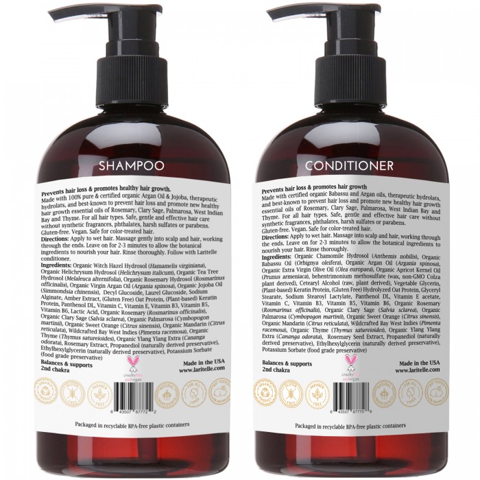 | Directions | Shampoo: Apply to wet hair. Massage gently into scalp and hair, working through the ends. Leave on for 2-3 minutes to allow the botanical ingredients to nourish your hair. Rinse thoroughly. Follow with Laritelle conditioner. Conditioner: Apply to wet hair. Massage into scalp and hair, working through the ends. Leave on for 2-3 minutes. Rinse thoroughly. Massage gently into the scalp for 2-3 minutes. Style your hair as usual. For best results, repeat daily. Store in a cool dark place. |
