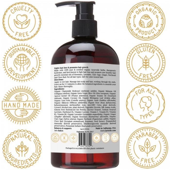 • ORGANIC CONDITIONER TO STOP HAIR LOSS & PROMOTE NEW HEALTHY HAIR GROWTH. Softens hair, nourishes the hair-shaft, rejuvenates hair follicles. Made with certified organic Babassu, Olive, Apricot Kernel oils and Ayurvedic herbs, therapeutic hydrolats, and best known to stop hair loss and promote new healthy hair growth essential oils of Rosemary, Lavender, Clary Sage, Ginger, Patchouli and Clove Bud.