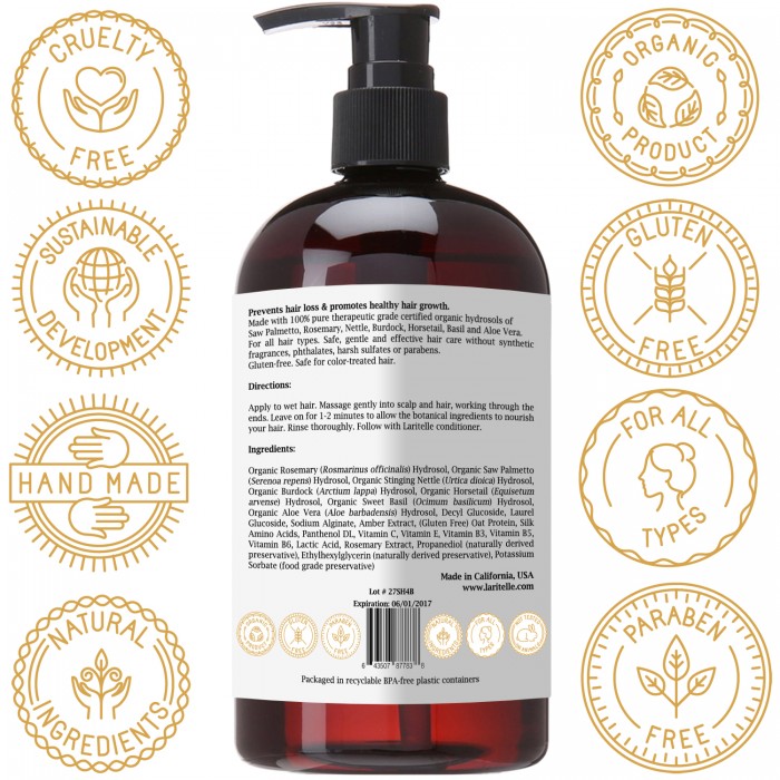 ORGANIC SHAMPOO TO PREVENT HAIR LOSS & PROMOTE NEW HEALTHY HAIR GROWTH. Softens hair, nourishes the hair-shaft, rejuvenates hair follicles. Made with 100% pure therapeutic grade certified organic hydrosols of Saw Palmetto, Rosemary, Nettle, Burdock, Horsetail, Basil and Aloe Vera.
